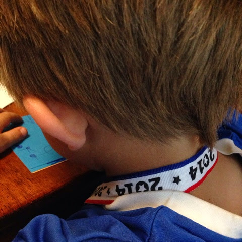 Both boys are in a flow. Jules is making a end-of-year card for his bus driver. "What comes after the 's' in vacation?" Uhh....